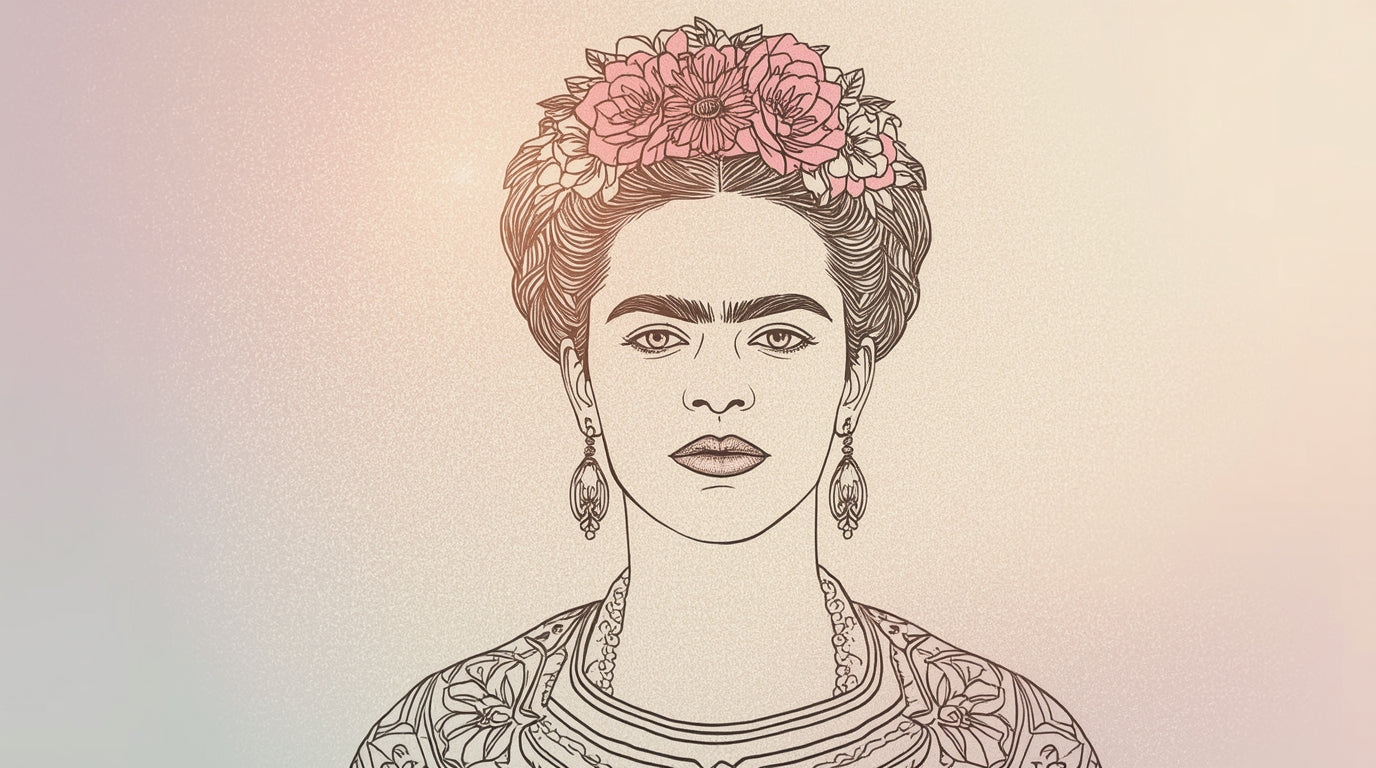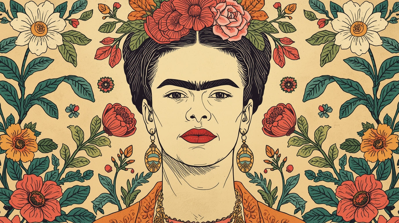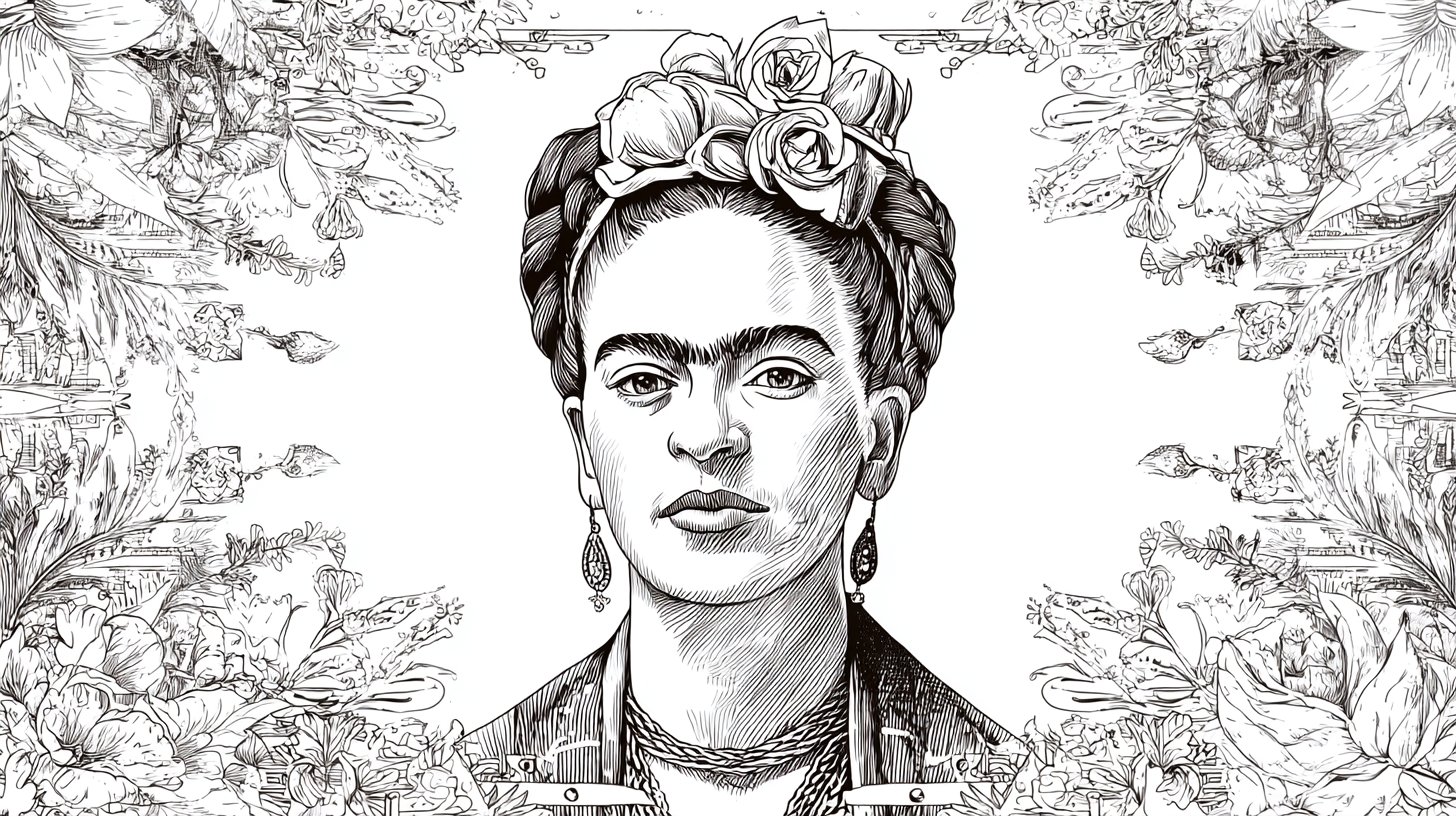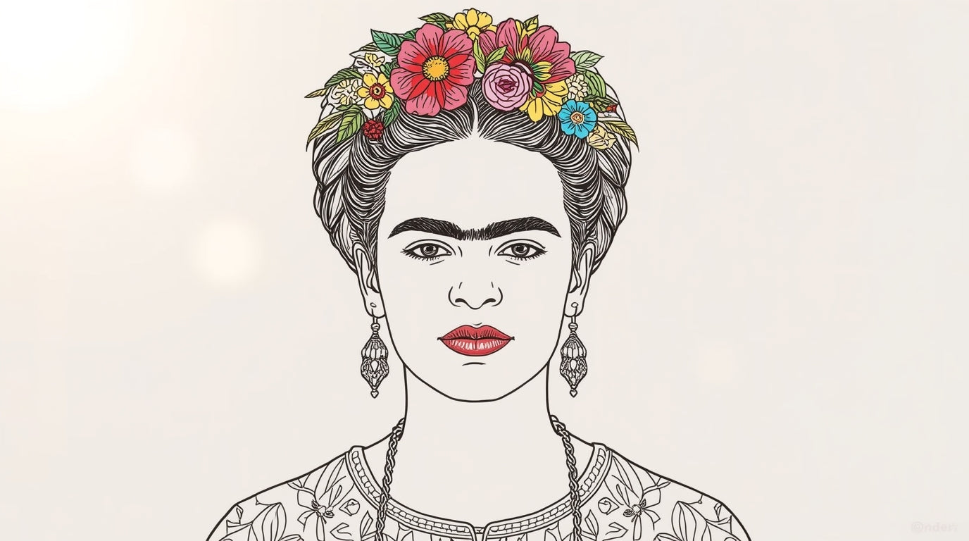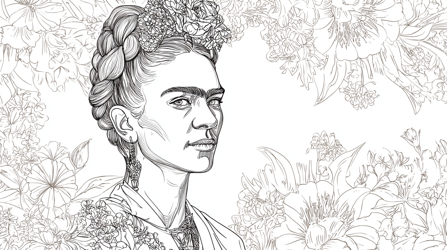 Line-art Kahlo portrait with floral Mexican folk motifs, celebrating strength and culture.