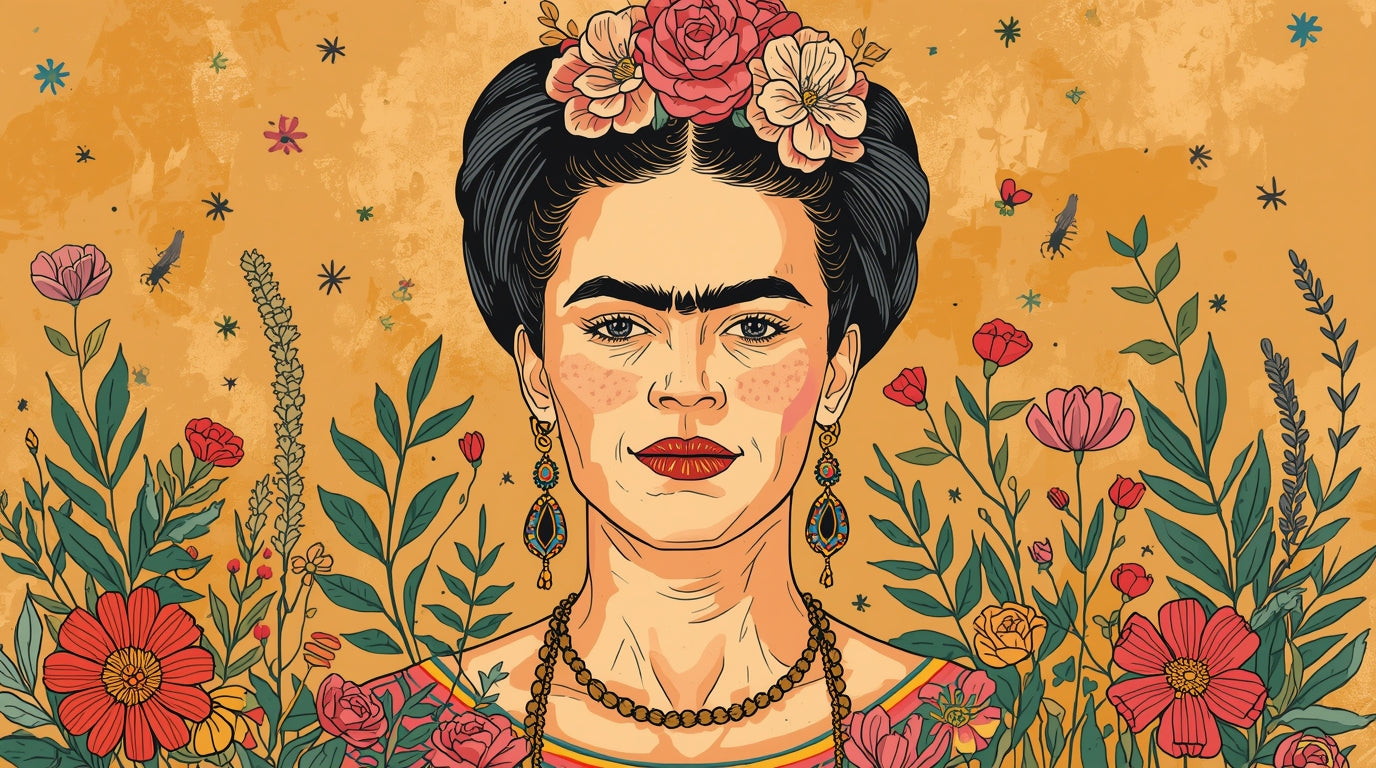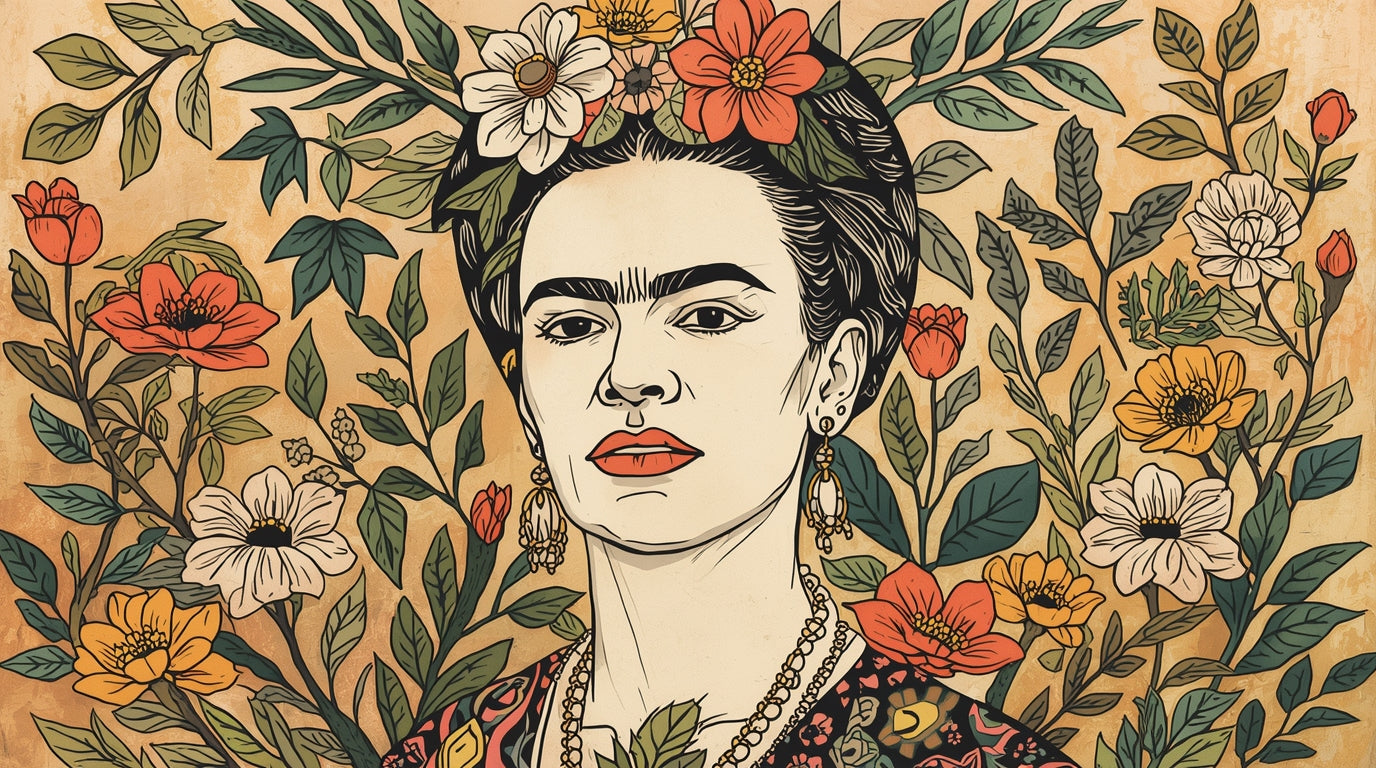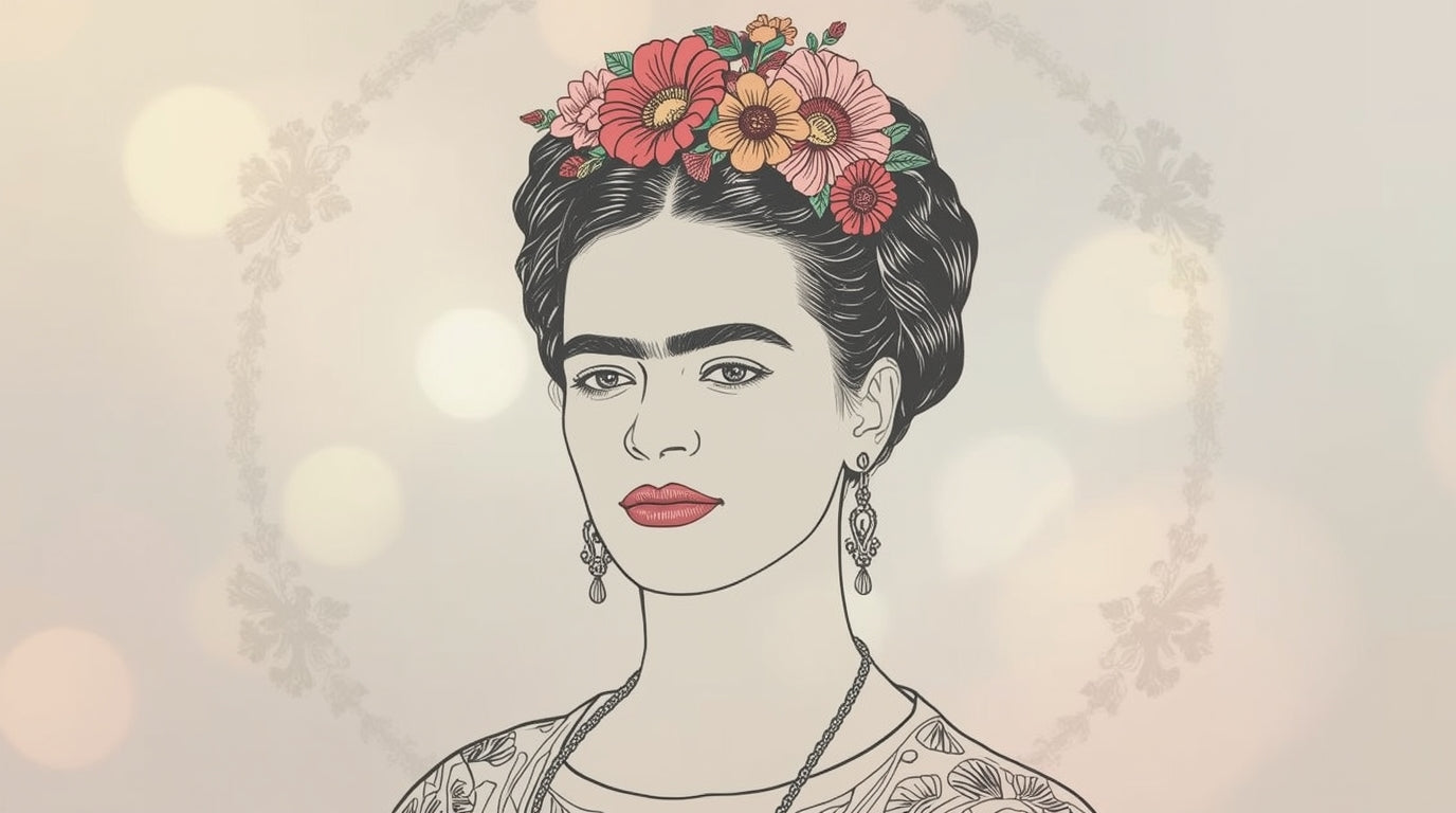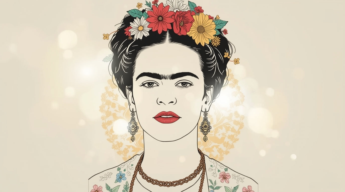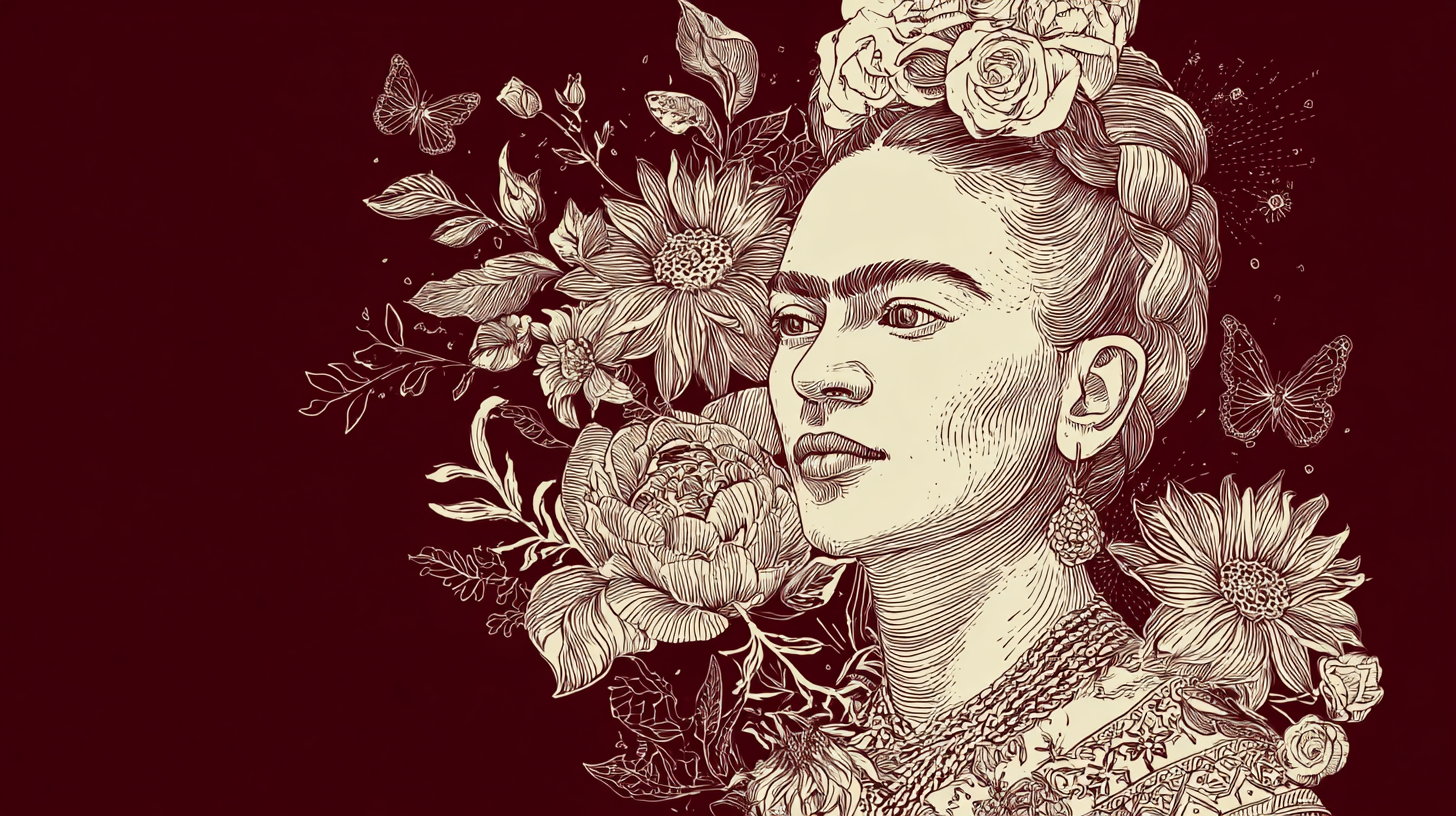 Line-art Kahlo portrait with floral Mexican folk motifs, celebrating strength and culture.